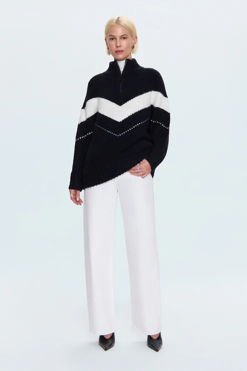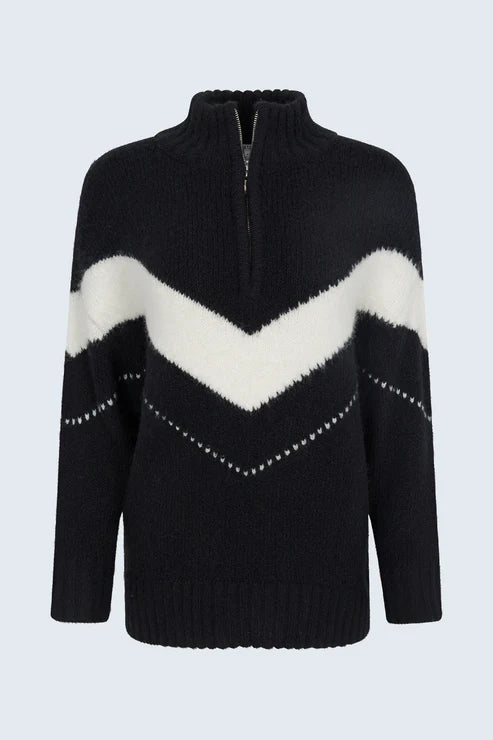 A modern knit with graphic appeal, Arden features a relaxed silhouette and half-zip neckline. The bold chevron colorblock pattern in Black Vanilla Ice delivers contrast and dimension while keeping the look timeless and versatile.
