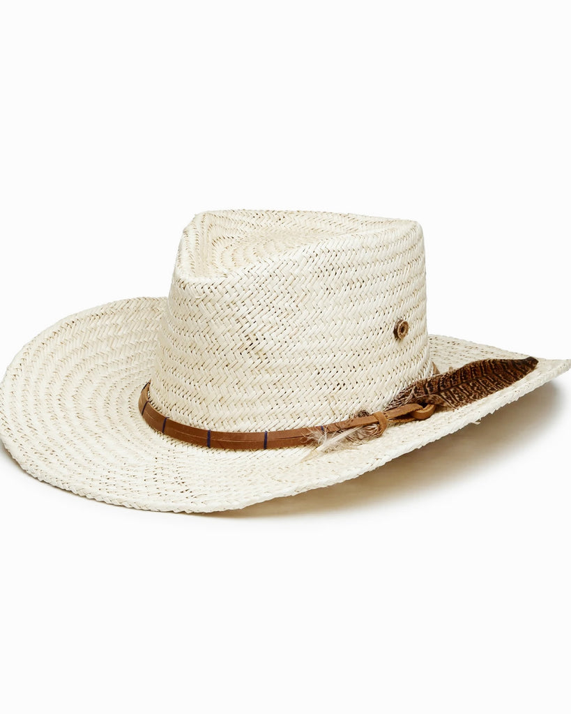 100% Straw cowboy with genuine leather band, feather and Wyeth button