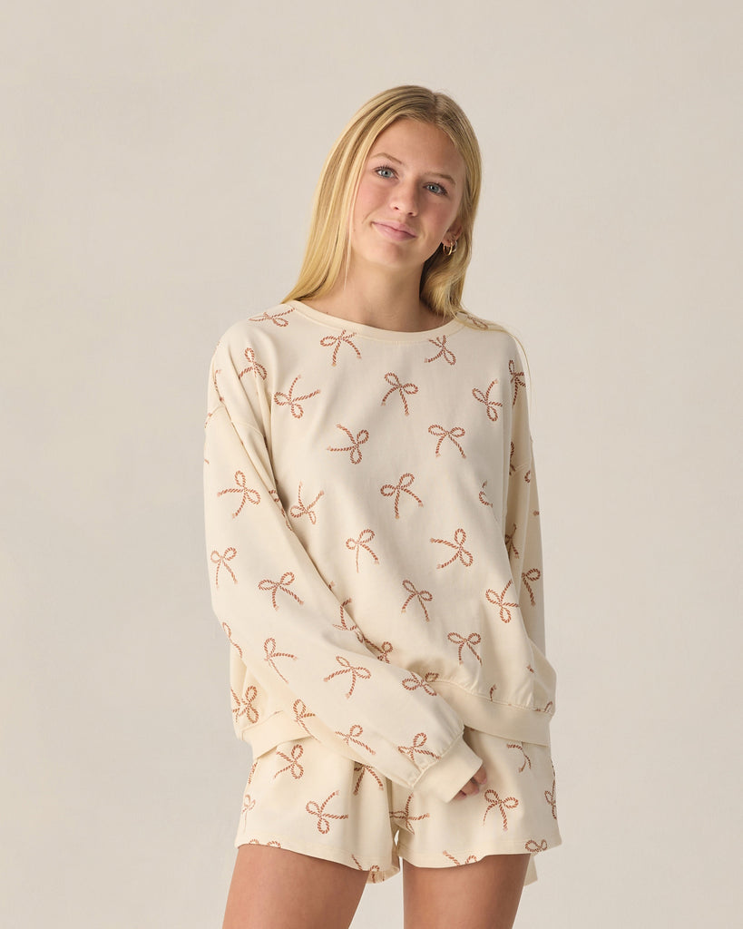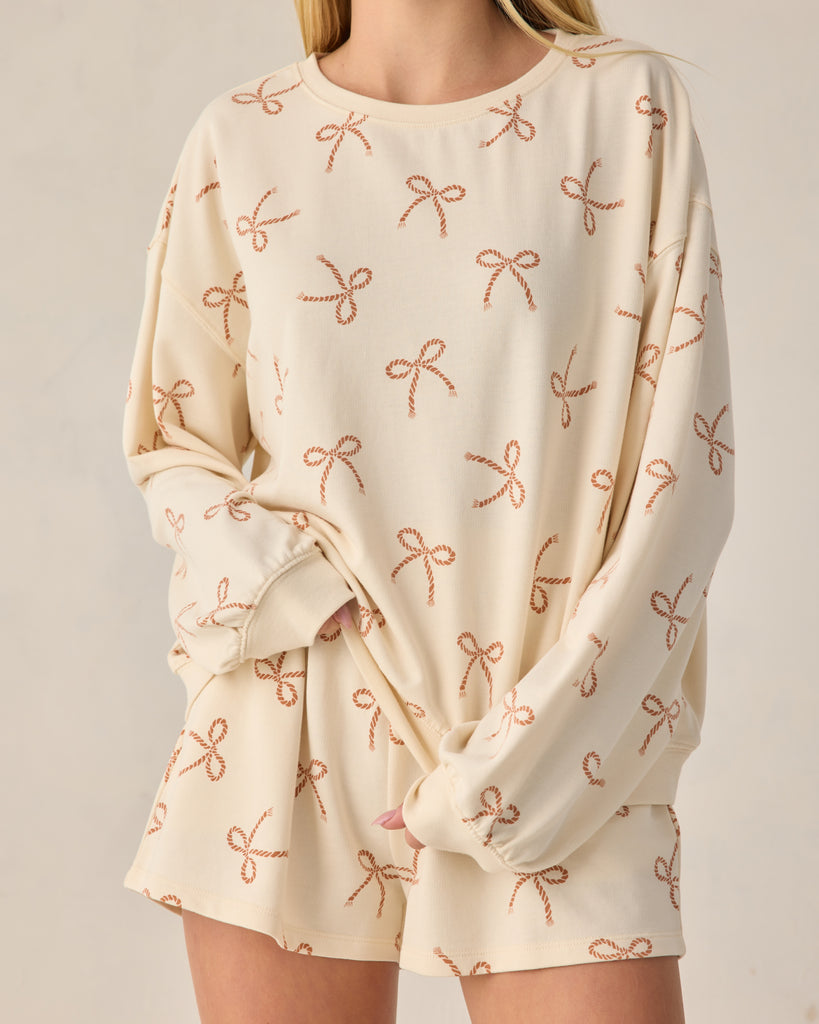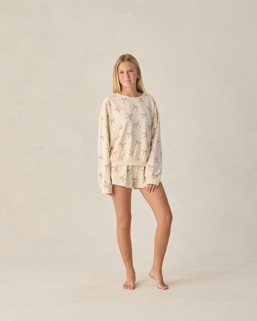 A relaxed sweatshirt and matching shorts with an elastic waistband come together in this cozy terry cloth summer set.