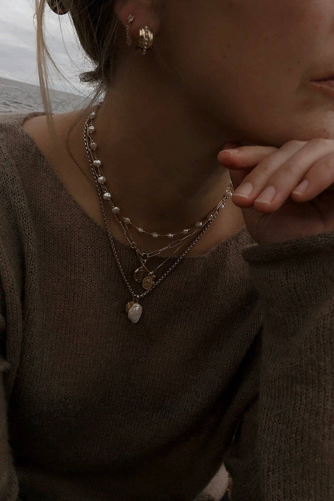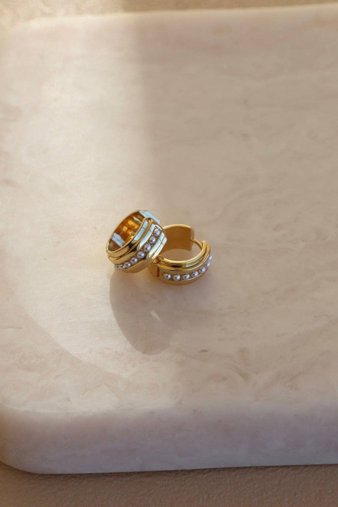 The Row earrings marries the timeless luster of pearls with a bold, architectural silhouette. Featuring a substantial, thick metal huggie bisected by a pristine line of faux pearls, this pair offers the perfect balance of edge and elegance. It’s the classic hoop, toughened up for the modern woman. Materials Faux pearls Gold plated brass Size & Dimensions Outer Diameter 18 mm, Thickness 8 mm SKU: E1791
