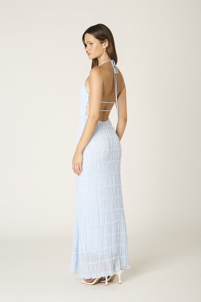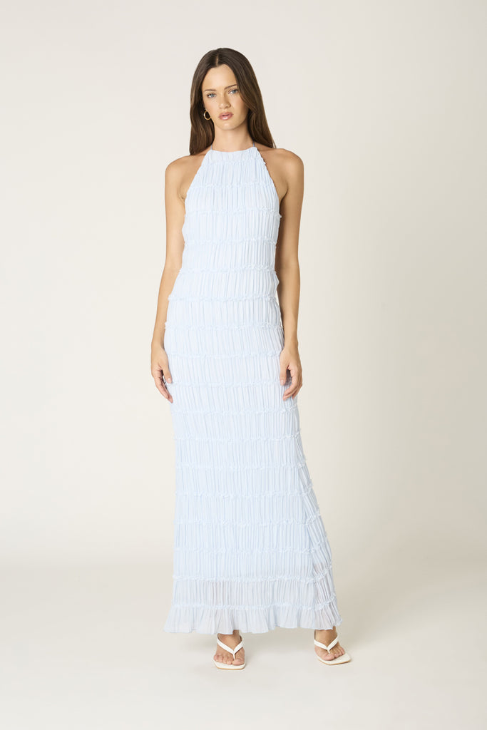 - Chiffon halter maxi dress with sheer crinkled textured, delicate horizontal ruching, and an open back with tie straps.