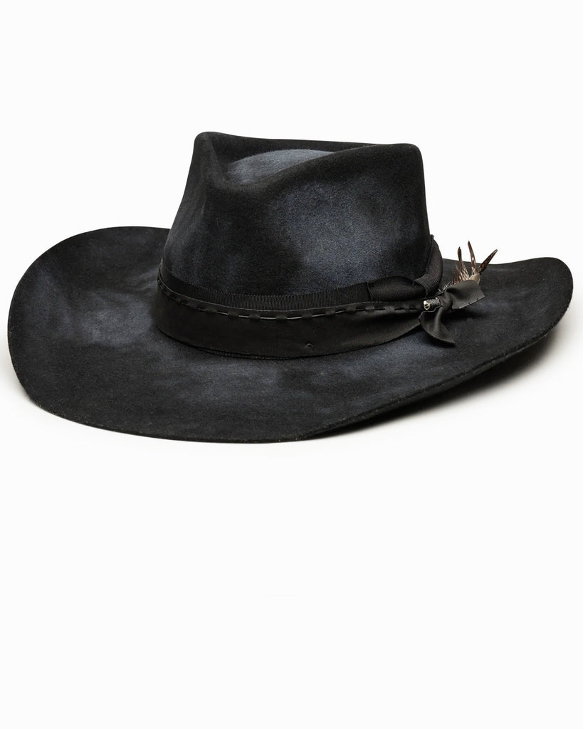 Structured silhouette, classic cowboy design, teardrop crown, upturned brim, contrast layered ribbon and feather detail, vintage effect. Made from Australian wool felt.